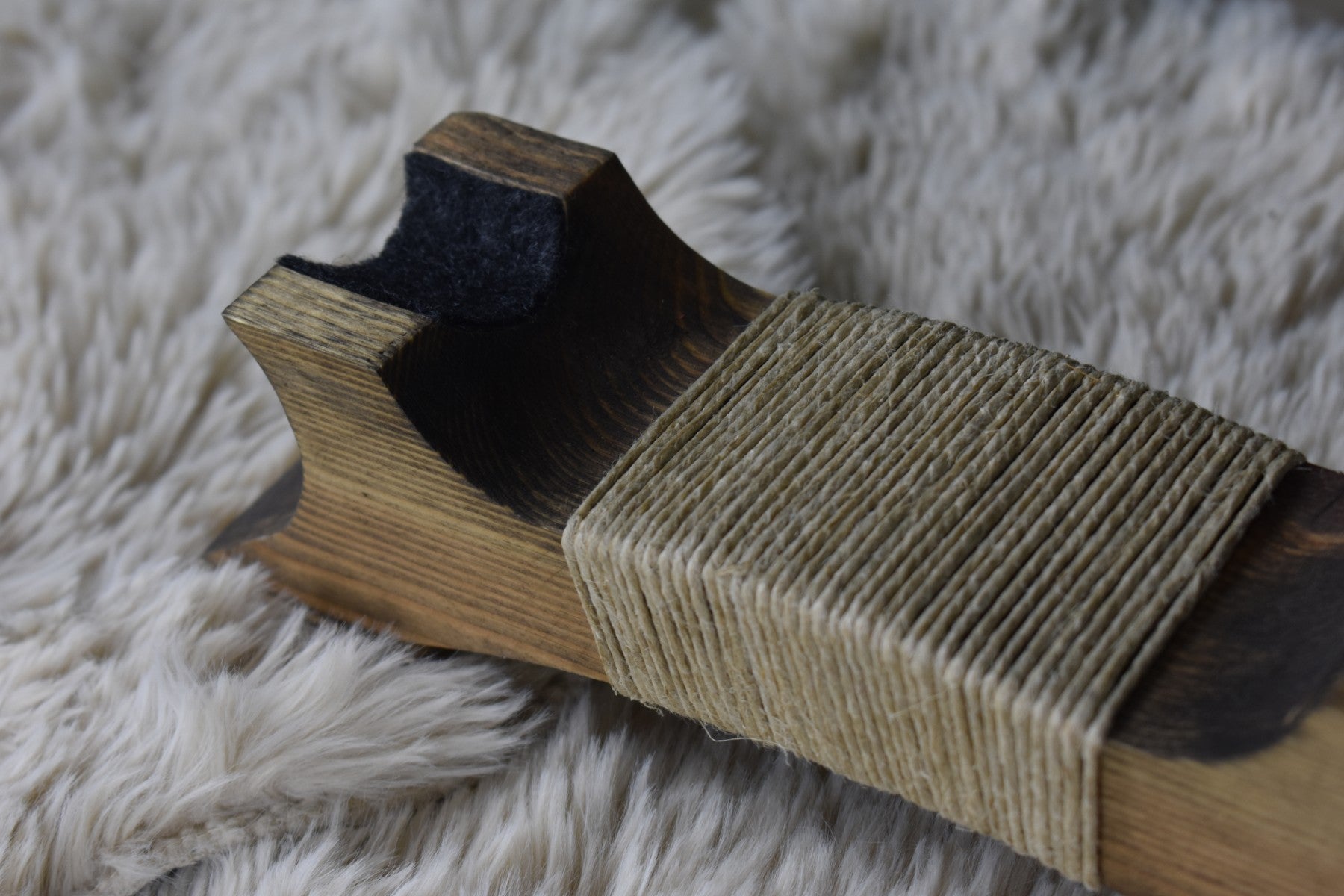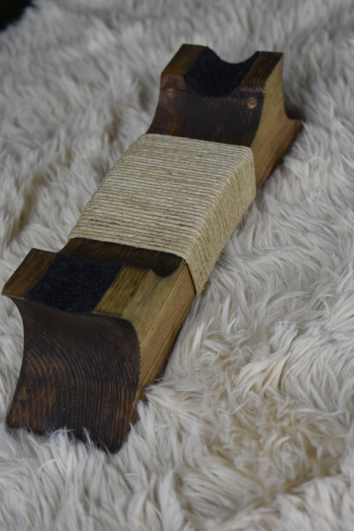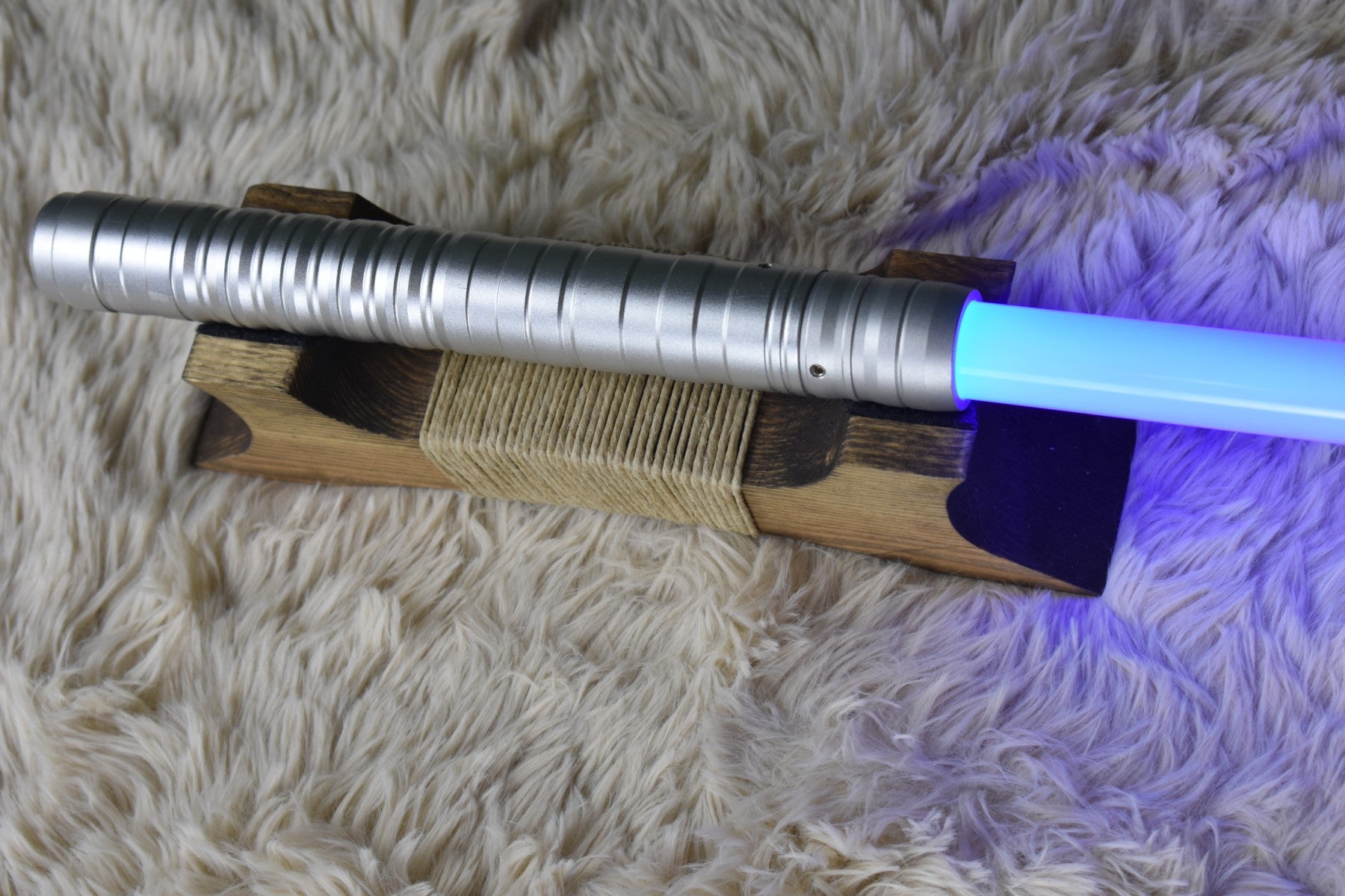 Handgemaakte lightsaberstand met henneptouw-wikkeling. Rustig, organisch design dat jouw prop de spotlight geeft.